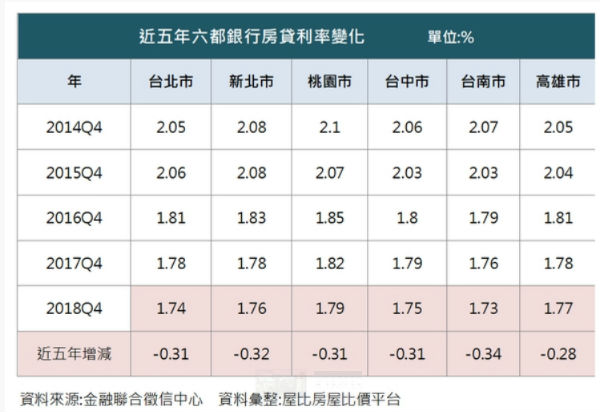 新北、桃園、台中、台南、高雄走勢全部一樣,2015第4季各都平均房貸利率都在2%以上,最高的新北市達2.08%,但到了2017第4季都跌至1.8%上下,2018年第4季更全面跌破1.8%;和五年前相比,六都房貸利率都下滑了0.28%~0.34%不等。